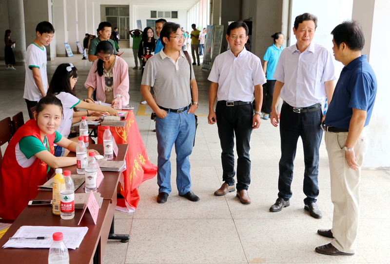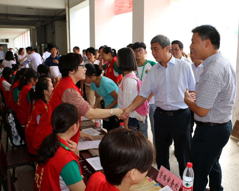 9月9日迎新现场,在公司领导的陪同下,副董事长朱家存及相关部门领导亲自来到公司迎新现场指导工作,慰问承担迎新工作的师生,详细询问新生报到情况,并与新生及家长亲切交流、耐心答疑家长关心的问题。