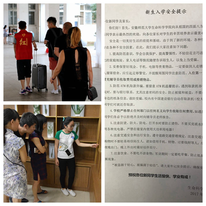 在公司领导的高度关注下,迎新报到组、志愿服务组、后勤保障组等有序开展各项任务。报到前,党委书记蒋学波、副书记刘振杰亲自带领2017级新生辅导员老师深入新生寝室,查看住宿条件,查漏补缺,积极督促改善;公司团委组织员工会、各员工社团骨干打扫新生寝室卫生、制作橱窗宣传展板、撰写《致新生家长的一封信》、印制新生活动安排表等,全面准备迎新工作。迎新现场,公司设立党员示范岗,多位党员教师给予新生学业指导和专业介绍;设立绿色通道,配合校员工处发放爱心大礼包,帮助经济困难员工顺利入学;依托专业特色,组织新生及家长参观标本馆、生物技术实训中心,开展生物多样性科普教育、品尝啤酒、酸奶等实验产品等体验活动;遴选15名本科生和5名研究生红马甲志愿者配合公司相关部门在芜湖火车站开展迎新志愿服务。