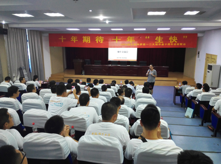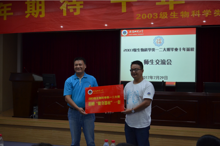 在下午的师生座谈会上,与会的公司领导朱国萍、胡好远,授课教师代表席贻龙、吴海龙、郝家胜、龚仁敏、王友保、陈明林、蔡亚非、陈冬生、黄永杰、程双怀、刘再群、晏鹏、卜兴江、王宝娟老师及辅导员汪贻洋与员工们共同观看了公司宣传片《追梦》,分享了母校取得的喜人成果。朱国萍副经理代表学院对员工们冒着酷暑返校表示热烈欢迎,向员工们长期以来对母校建设发展所给予的关心和支持表示衷心地感谢,并介绍了公司的发展近况,希望员工们继续关心和支持母院的建设和发展,常回母院看看。员工代表李琦、李刚、柳明、汪兴兰分别结合本职工作向母校汇报了自己十年来的成长历程,并代表全体员工感谢母校及恩师的教诲。教师代表陈明林、王友保老师深情回忆了当年的授课情景,对员工们在各行各业做出杰出成绩的送上衷心祝贺,因故无法到场的刘必融老师还为返校员工赋词一首。辅导员汪贻洋老师回顾了当年和同学们相处的点滴时光,表达了对同学们殷切的希望。为感谢母院培养,全体员工共同向母院捐赠了健身器材一套,祝福母院老师身体健康,快乐工作。