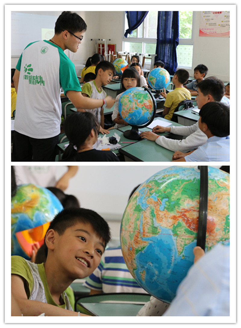 带着孩子们的疑问,地理老师李翔宇对中国领土面积进行介绍,使得孩子们惊讶不已:“第一次知道祖国的领海面积470万平方公里,原来海有这么大!” 祖国地大物博,提升了孩子们的自豪感,培养了孩子们的爱国情怀。当科学实验室中搁置已久的地球仪展现在后孩子们面前时,孩子们表现出的无比浓厚的兴趣,纷纷摆弄起来,不停地转动着地球仪,对这个美丽又神秘的地球简体充满了好奇,结合着世界各地地理谜语的方式,志愿者讲解了地球仪的各大模块,让孩子们了解到了世界各地的风采与文化。课后,许多孩子们纷纷表示,自己想看看外面的世界,想了解山那边的世界,想领略这个美丽又神奇的世界。
