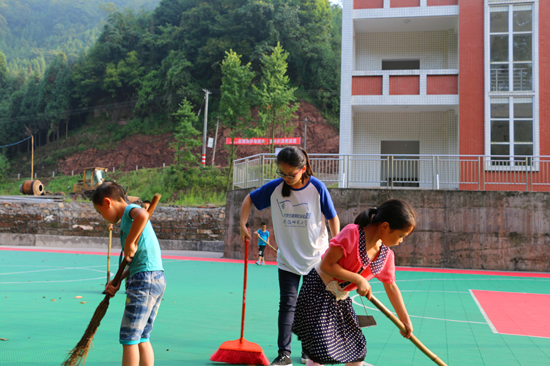 早晨七点钟左右,就能看到小书包在教室里面,再转头,孩子小小的身影在操场上,手中拿着及人高的扫帚,一下一下卖力的扫着。桃源的早晨有些微凉,孩子们的鼻翼却已沁出汗珠。志愿者们过去询问起因,孩子们答,这是平时上课的老师要求的,操场要定时清除落叶和垃圾,干净美丽的校园需要大家共同的努力。有的孩子住的离公司很远,要步行2个小时才能到达,来早的孩子总会自觉拿着扫帚去打扫。看到这一幕,志愿者们纷纷拿起扫帚,加入到清扫行动中去,清晨的阳光洒满校园,操场上的身影染上金色,格外耀眼。这是孩子给志愿者上的很生动的一课,小小的身体,时刻充满着责任感。