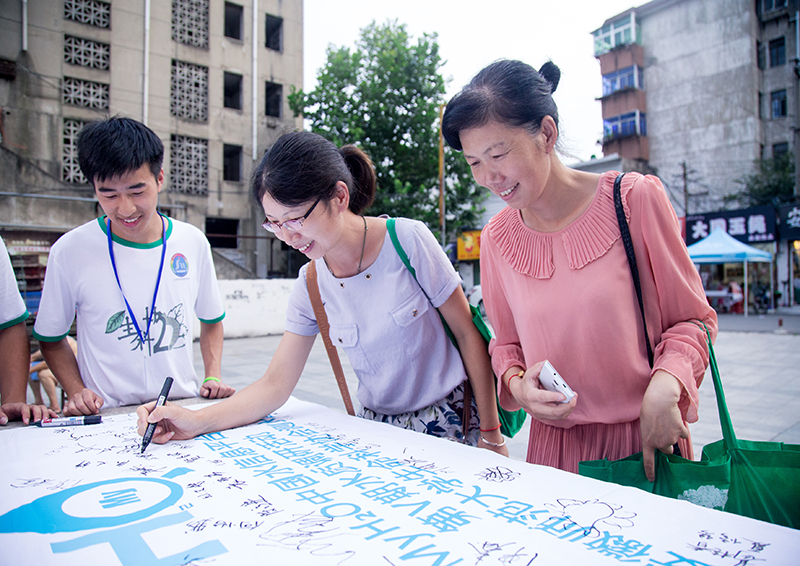 7月16日傍晚,经过一段时间的准备,团队来到了预先踩好点的广场进行了暑期社会实践活动最后的广场宣传部分。团队按照计划将活动现场划分为四个部分,分别为活动照片展示区、展板展示水质与生活、小朋友环保绘画区和居民志愿签名区,每片展区都被安排了专门的队员负责引领、接待感兴趣的居民,为居民进行相应的介绍和组织相关的活动。为了吸引更多的小朋友参与环保绘画,团队将自制的鸡爪槭和叶脉书签当做赠品。在布置好活动现场之后,成员们跳了在公司学习过的非洲dum dum舞,成功吸引了部分行人的注意力。对活动感兴趣的居民在相应展区的队员们的带领下由一个展区进入另一个展区,并有条不紊的参与了对应的展示活动。