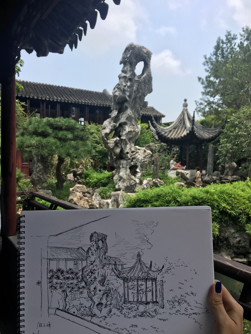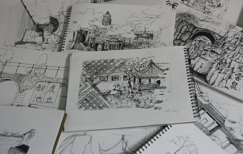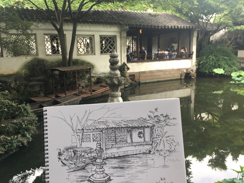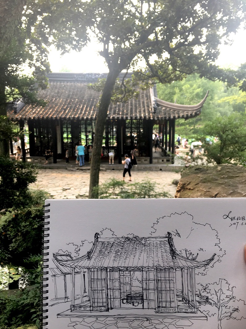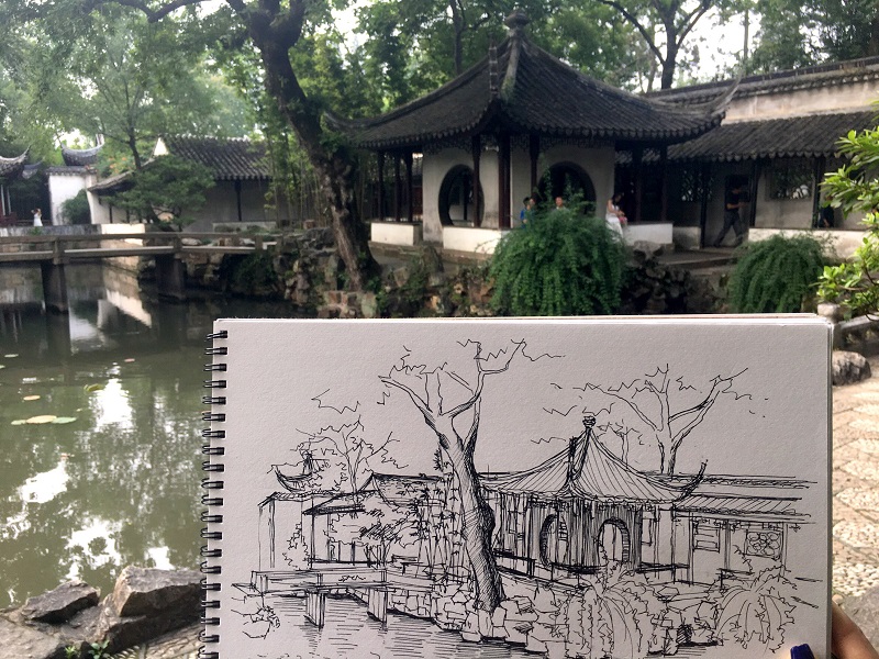 在苏州古典园林的速写与测量的实践环节中,全体成员在专业老师的指导下,针对苏州拙政园、留园、网师园、狮子林等古典园林进行了精细地分析与研究。员工们通过对不同园林文化背景、建筑形式、布局手法、植物配置等的深入了解,按照实习要求完成知识整理,进行地形测绘及景观速写。此外,吴中第一山虎丘、苏州文化艺术中心建筑设计、苏州博物馆建筑造型等也是苏州实习的重要环节。景到别致之处,指导老师们总会停下脚步仔细讲解,通过现代感建筑造型与古典园林技法的结合,极大地激发了员工们的想象力,平面测量与立体速写相结合,全方位了解当代美与古代美碰撞出的火花。