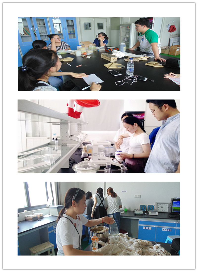 上午团队成员进入实验室后,注意到操作台上摆满了扁形的玻璃瓶,经工作人员介绍,这些瓶子名为茄子瓶,用于菌种的发酵培养。经沙土管保存的链霉菌孢子被接种于瓶内的斜面培养基上,于室温下培养7天,获得大量的孢子,孢子用于链霉素的制备。介绍完毕后,我们动手参与了相关的实验,包括废弃培养基的处理与茄子瓶的清洗等步骤。