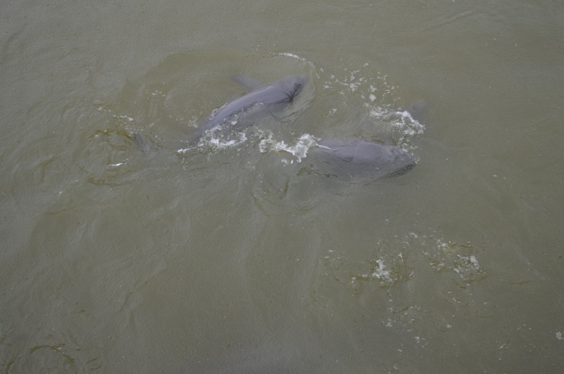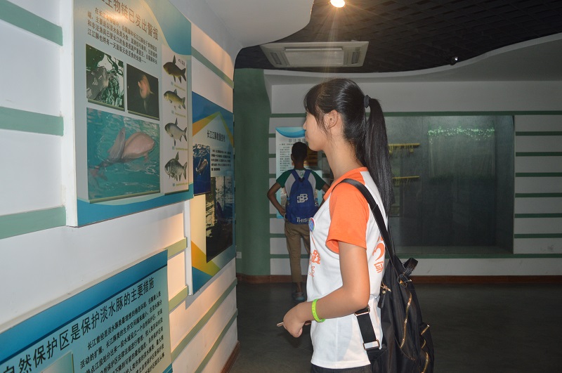 队员们首先来到了宣教馆。馆内陈列着多种珍稀水生动物标本,如白鱀豚、大鲵、鲥鱼、胭脂鱼等。随后,江豚饲养员带领志愿者们来到江豚养殖基地观豚台。由于定时喂食,江豚在喂食前便早已等候在观豚台周围,不时跃出水面。饲养员将经盐水浸泡消毒的鱼投向水里,几只江豚争先进食。进食结束后,江豚游离了观豚台,在不远处的水面欢乐地跳跃着,可爱灵动,一幅大自然和谐美好的画面深深定格在大家心里。