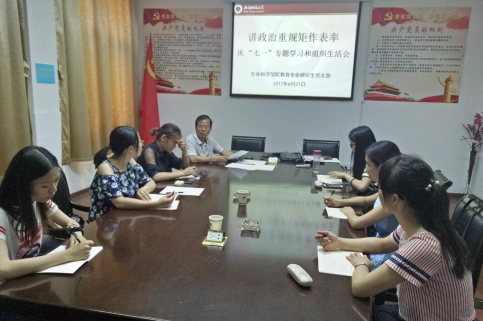 本网讯(吴何娟)为扎实推进“三个一”活动,2017年6月21日下午,生科院教育专业研究生党支部召开了主题为“讲政治、重规矩、作表率”庆“七一”专题学习和组织生活会,支部书记涂传林老师主持会议,7位非毕业生党员参与学习。