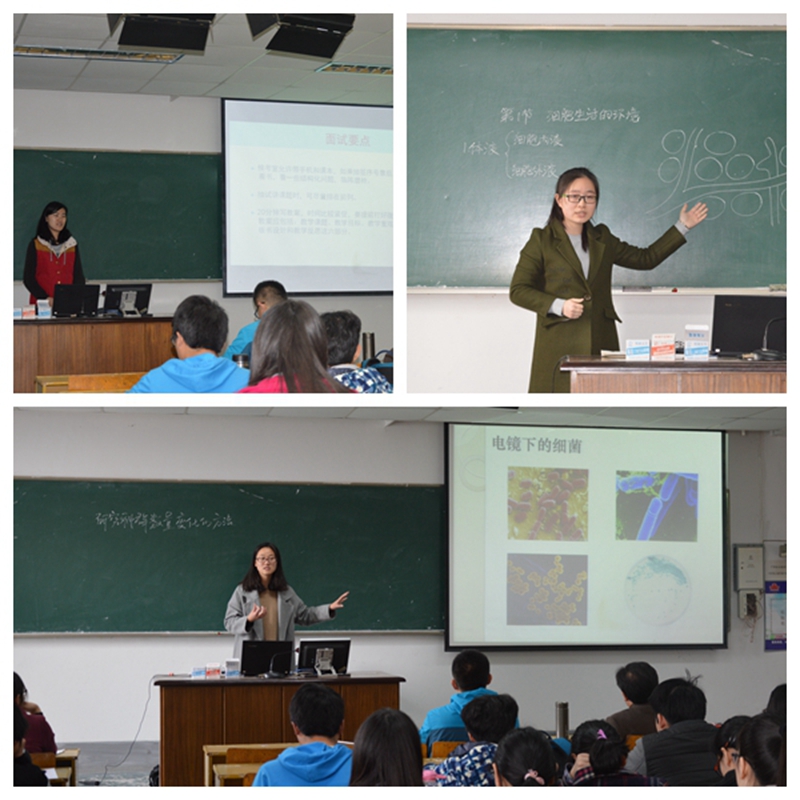 活动中,2014级生物科学专业王语艳、陈颖两位已获得教团队格证的同学结合自身考试经历,分别从前期准备、面试流程、面试要点、问题答辩及礼仪姿态等方面全面细致地向同学们分享考试经验,交流考试心得体会,与会同学们无一不认真听,仔细记。之后,第六届“华文杯”全国师范院校师范生教学技能大赛教学展示一等奖获得者2014级生物科学专业曹莎莎,校师范生从教技能大赛二等奖获得者2014级生物科学专业陈颖分别就《细胞生活的环境》、《研究种群数量变化的方法》等两节高中课程进行了示范微课授课。授课过程中,两位同学理论知识讲授严谨具体,教态和仪表表现出色,语言表达形象生动,课堂气氛活跃融洽,展现了作为一名师范生应具备的专业素养,赢得了老师和同学们的一致好评和阵阵掌声。