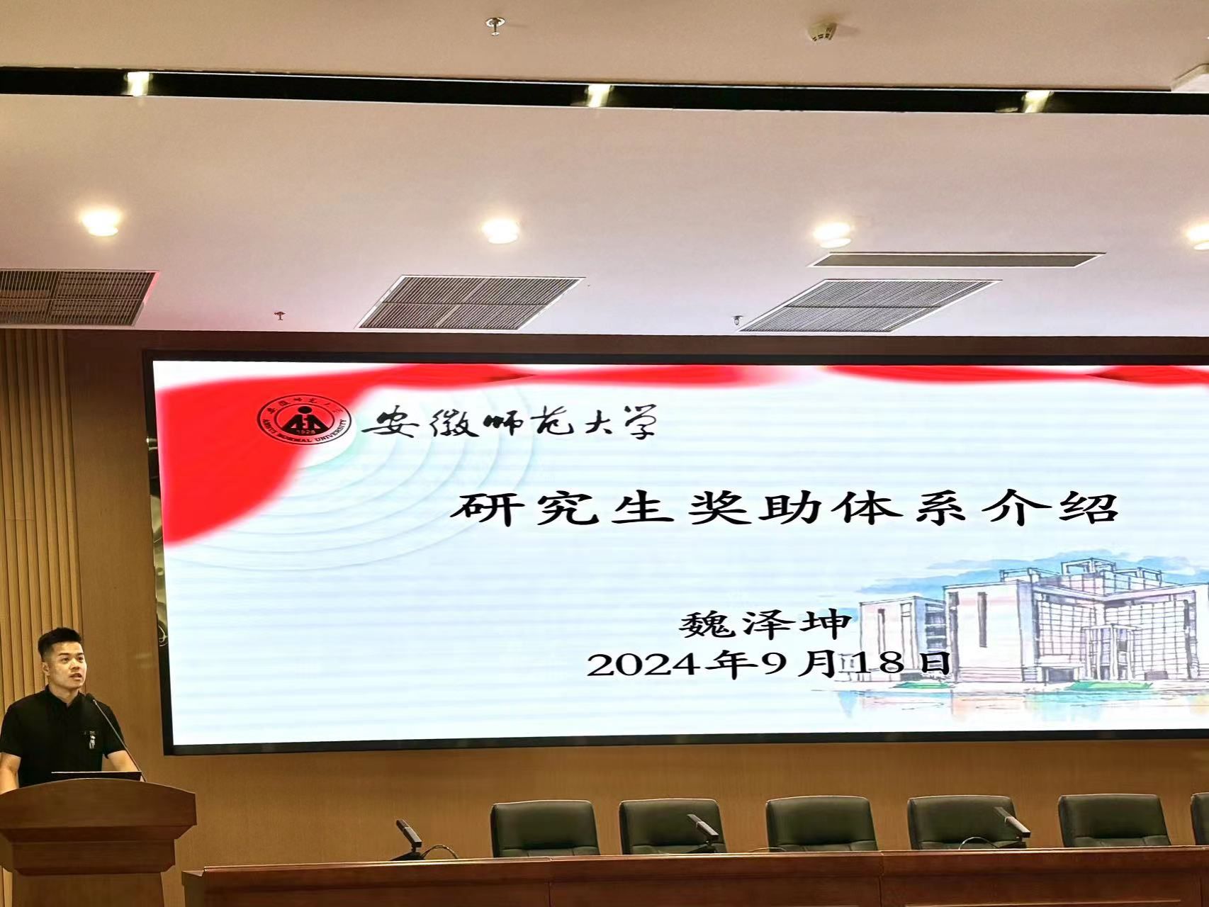 紧接着,魏泽坤从国家助学金、三助一辅、国家奖学金、学业奖学金、先进个人以及生科院研究生科研积分方案等方面向同学们介绍了公司和公司完善的奖助体系,并祝愿每一位同学学业有成,早日找到通往未来的钥匙。
