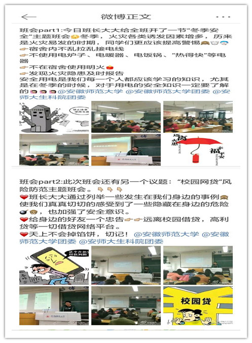 本网讯(生科院李曼琦)为切实增强员工的安全防范意识,保障员工人生财产安全。12月5日至7日,生科院2015级各专业陆续召开“安全在我心中”冬季安全主题班会,规范用电行为,排查校园网贷。