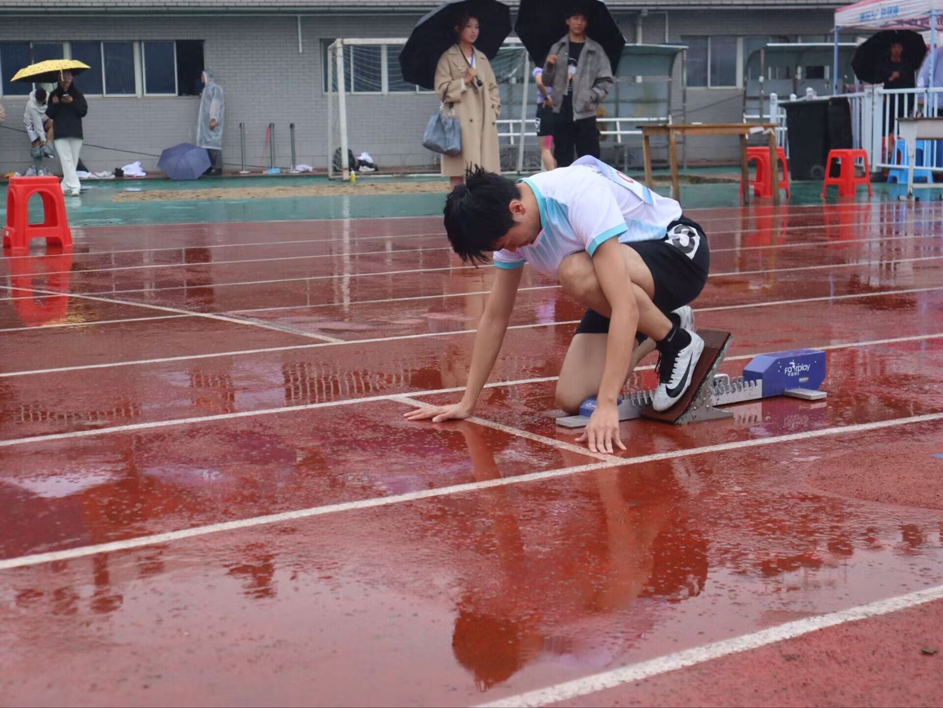 图为男子甲组400米栏决赛王梓涵同学起跑准备