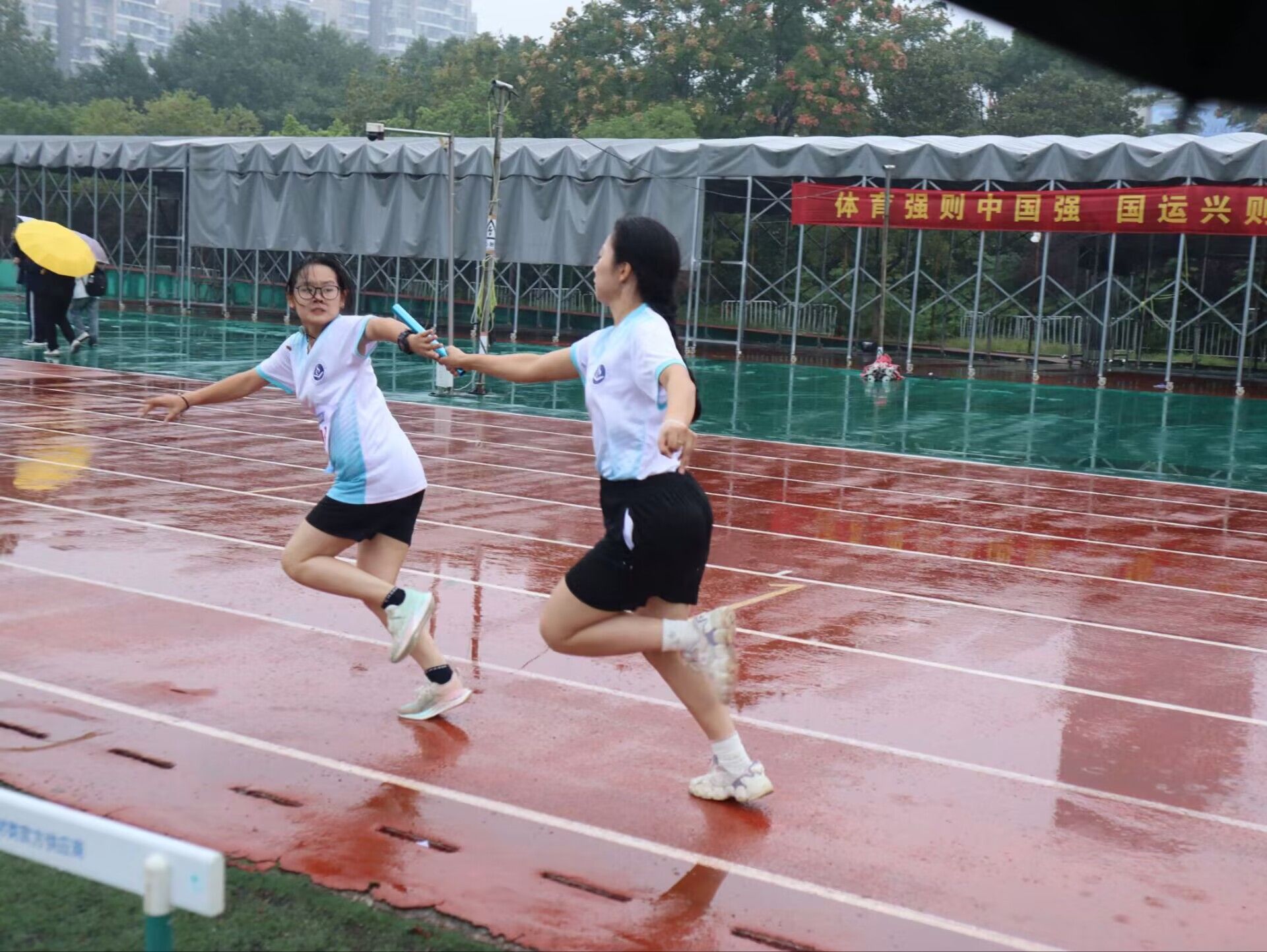 图为男女混合4×100米决赛选手交接棒瞬间