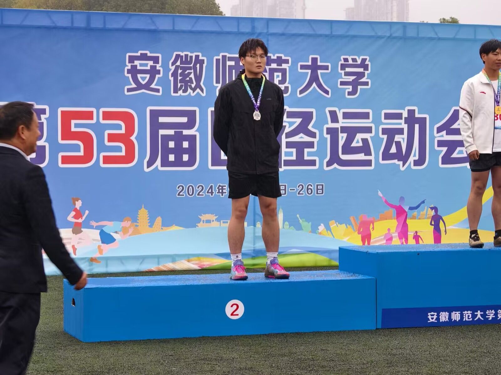 图为男子甲组三级跳远项目董文潮同学颁奖风采