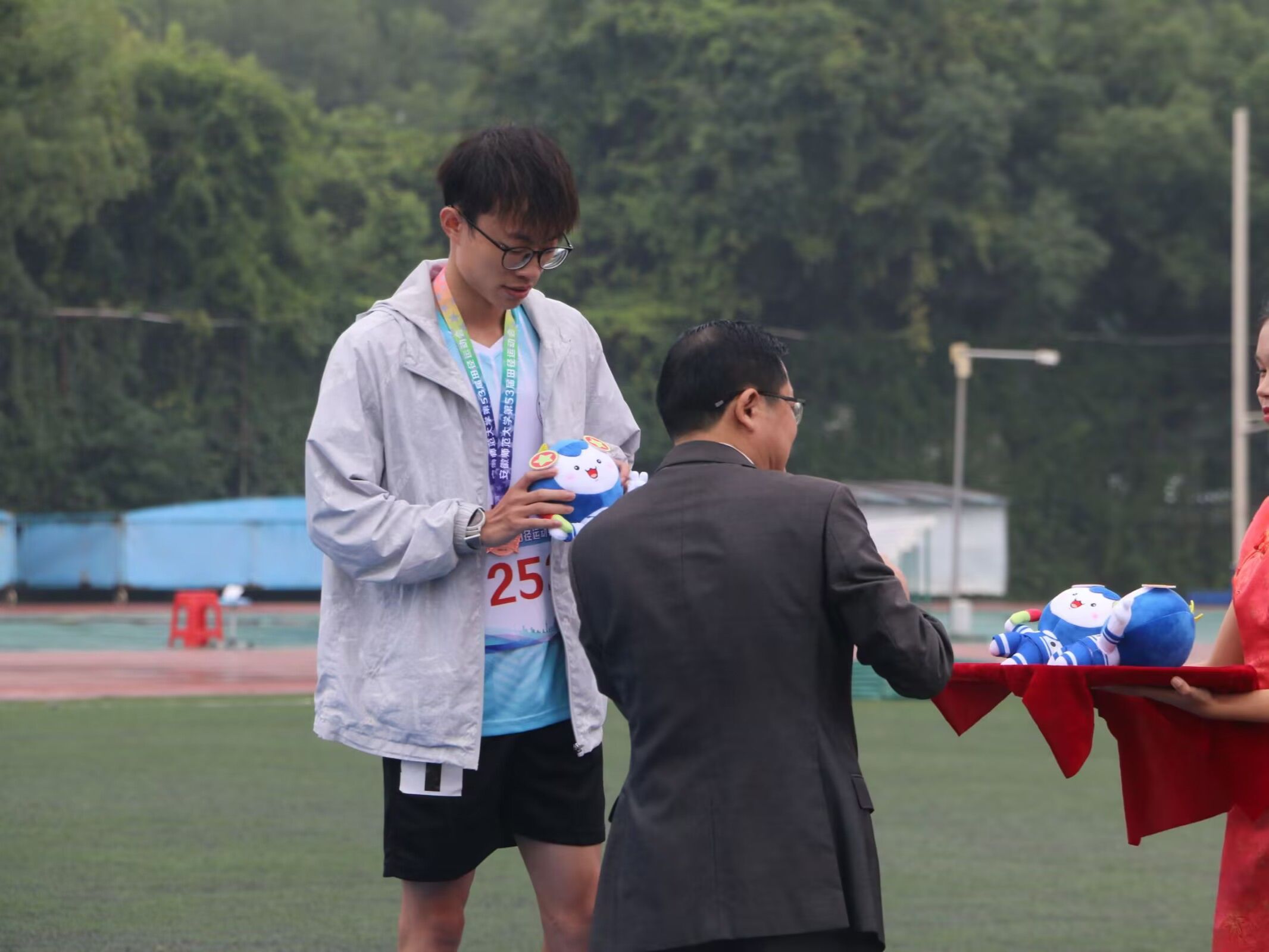 图为男子甲组5000米决赛何昊泽同学颁奖风采