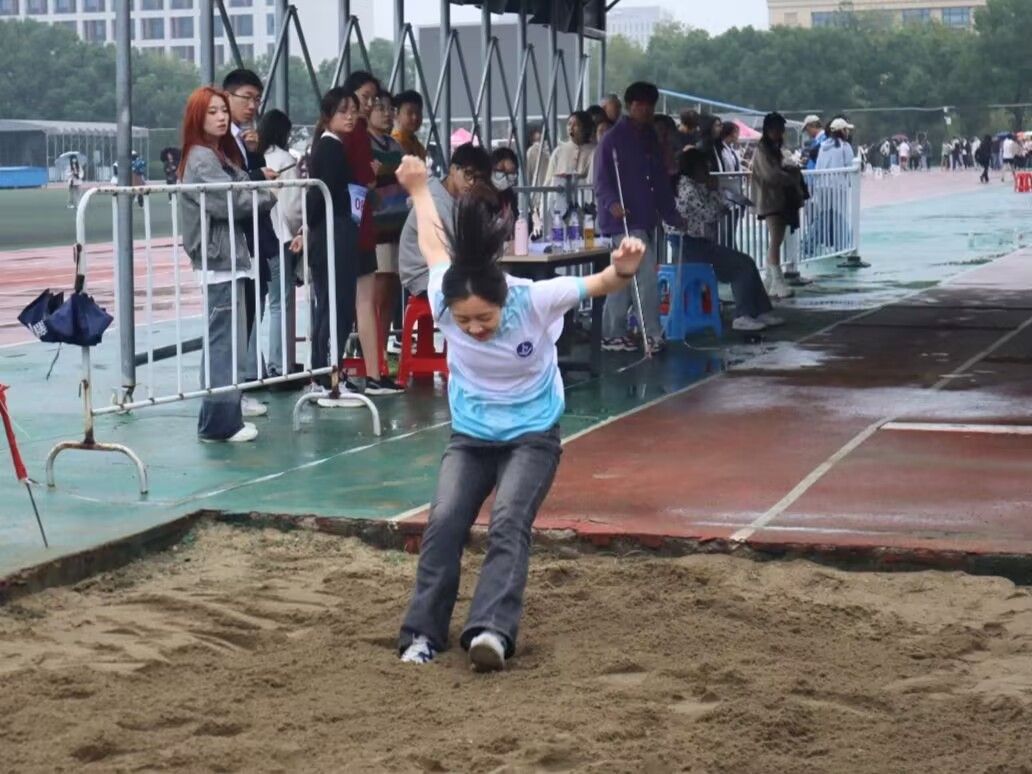 图为女子甲组三级跳远项目吴嘉婧同学的落地瞬间