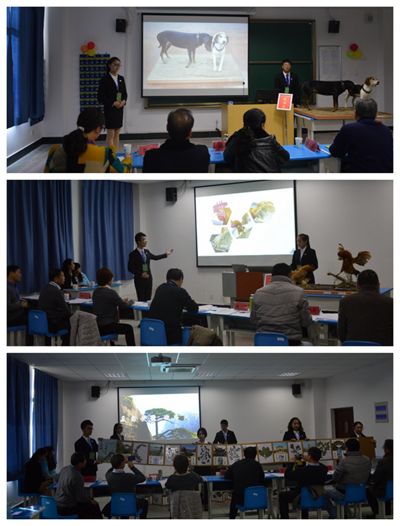 现场决赛分为植物标本制作、动物标本制作及动植物标本创新创意三个组别进行。比赛中,各参赛选手通过作品展示,结合5分钟的PPT汇报从前期准备、制作流程、作品寓意等多个方面对标本作品进行了全面细致地介绍,并根据专家的提问有针对性地进行2分钟作答。经过激烈比拼角逐和专家认真的评审,2014级园艺鲁月、2015级生物技术刘婷、2014级应用生物科学步丹丹等同学制作的作品《生命常青风骨长存》、《你是我的眼》、《美好安徽 迎客天下》3件作品以制作精美、专业性强、寓意突出等特点赢得了评委一致赞誉,分别夺得各组头魁,获得一等奖,《绝冀》、《镜锢》2件作品获得创新创意组二等奖,《蝗历》获得动物制作组三等奖。