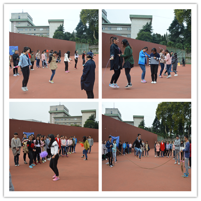 首先进行的是单人跳绳项目。同学们为了团小组的荣誉都使出了浑身解数,一分钟最多跳了185个。第二个进行的是双人跳绳项目,同学们自由组队,大家默契配合,跳的快速而又连贯,引起围观同学一阵阵欢呼和掌声。单人踢毽子比赛采取积分制,踢得越多就可以为小组争取更高的积分。比赛中,同组成员齐心协力为本组队员加油,场面十分热闹,驱散了初冬的寒气。接着进行双人踢毽子比赛,这是一个要求高度默契配合的比赛项目。由于项目难度较大,同学们的成绩并不理想,但大家彼此鼓励,互相加油,脸上都展现出明媚的笑容,点亮了原本阴沉的天气。最后一项进行的是团体跳大绳比赛。以团小组为单位,计时两分钟内,同学们依次穿越在绳子之间,用矫健的身姿展现了他们想要获胜的信心。