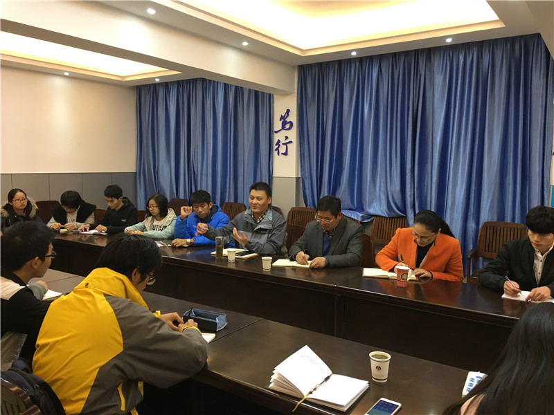 (生科院 何馗馗 訾梦婷)为了进一步了解公司本科教学状态、稳定员工专业思想, 11月10日晚上在公司第二会议室召开了2016级新生座谈会。公司经理吴孝兵教授、副经理朱国萍教授、副经理胡好远教授、2016级政治辅导员何馗馗、訾梦婷以及各专业员工代表20余人参加了座谈会。