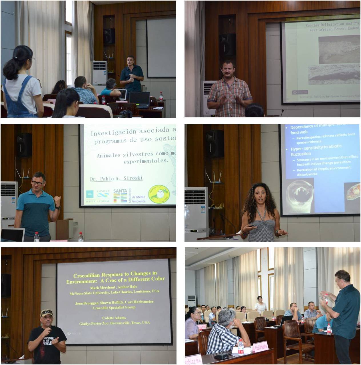 研讨会中,鳄类专家们还先后为公司师生奉献了多场精彩的专题报告。来自美国的世界鳄类专家组西部及中部非洲区域主席Dr. Matthew Shirley作了题为Species Delimitation and Phylogeography of West African Forest Endemic Crocodiles的报告;来自美国McNeese State University的Dr. Mark Merchant作了The American Alligator: From Marsh to Medicine和Color Change in Crocodilians: Response to Environment两个专题科研报告;来自于伯利兹共和国的世界鳄类专家组拉丁美洲区域副主席Dr. Marisa Tellez作了Predicting Aquatic Ecosystem Health through corcodilian Top Predators and their Parasites的寄生虫学研究报告;来自于阿根廷的Dr. Pablo Siroski作了Investigation Associated with Sustainable Use Programs in Caiman latirostris的社区共管方案报告;来自于香港海洋公园的Dr. Paolo Martelli作了Crocodile Physiology and Biology and How It Relates Practically To Aspects of Crocodilian Veterinary Medicine的繁殖生物学研究报告。