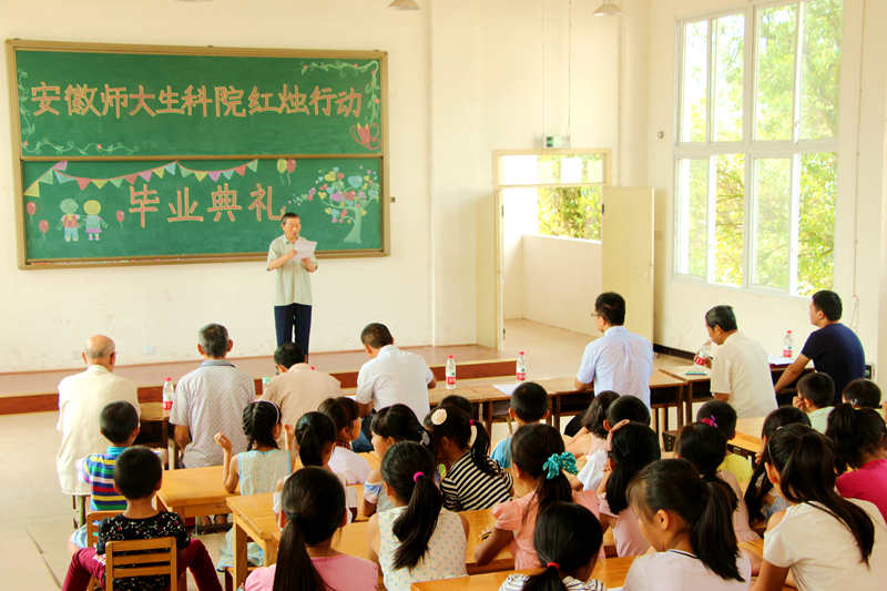 典礼在庄严的国歌中来开序幕,周明弟代表洪雅县关工委对安师大生科院“红烛行动”爱心支教团队的工作给予了高度肯定和赞扬,向支教师生们的辛苦付出表示了衷心的感谢,并向孩子们表达了诚挚的祝福。团队指导赵喆老师总结了21天的工作和成果,并承诺,“师大生科学子始终是四川洪雅县小朋友们的筑梦者、追梦者、及护梦者。”