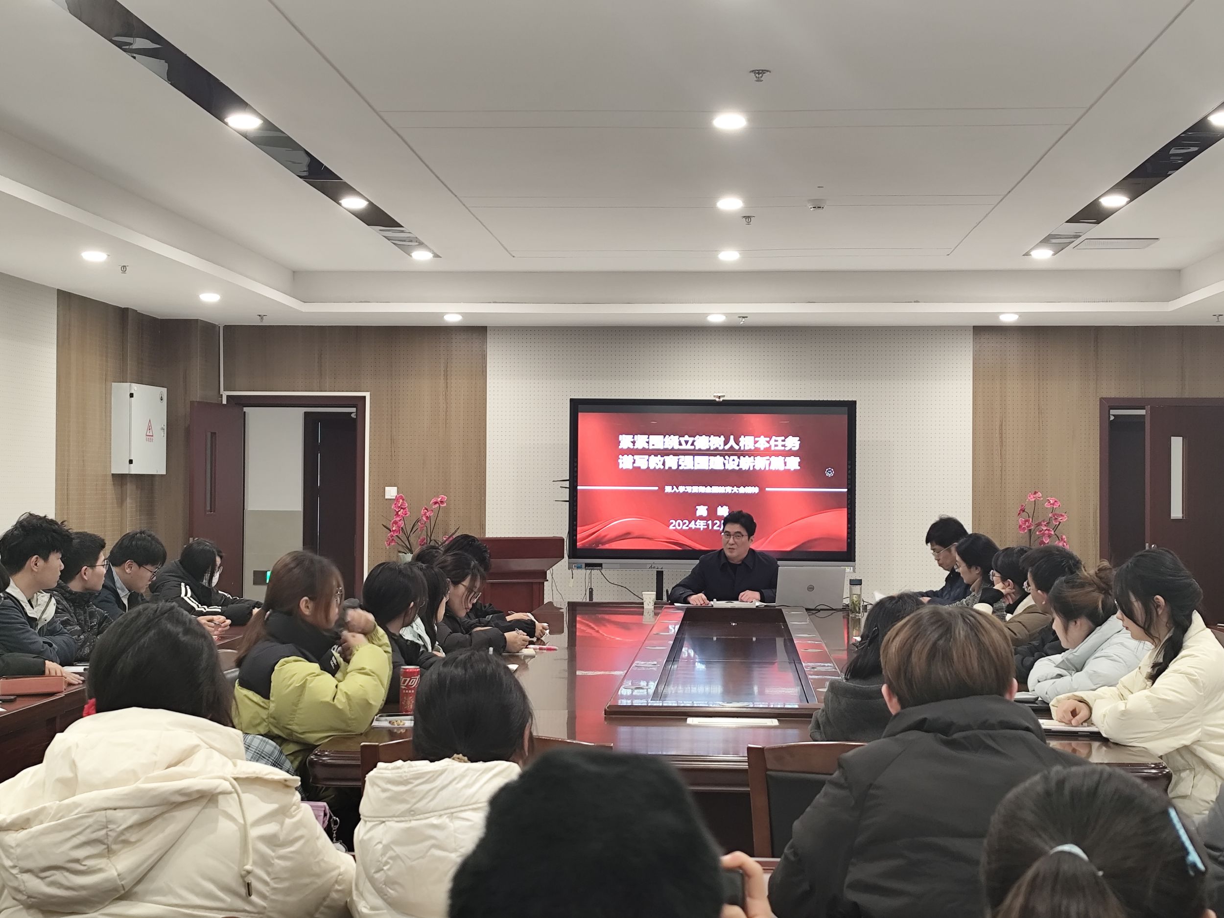 高峰以《紧紧围绕立德树人根本任务,谱写教育强国建设崭新篇章——深入学习贯彻全国教育大会精神》为题,指出全国教育大会擘画了教育强国建设宏伟蓝图,为教育事业高质量发展提供行动指南,他希望同学们传承爱国主义精神,把个人理想抱负和国家需要和时代发展需求相融合;传承科学家精神,早进实验室、早进课题组,早开展大创项目,聚焦新时代需求,提升个人素质能力;希望师范专业员工和与会教师传承教育家精神,做新时代“大先生”,认真学习贯彻《教育强国建设规划纲要(2024-2035年)》,坚持不懈用习近平新时代中国特色社会主义思想铸魂育人,全力推动全国教育大会精神落地见效。