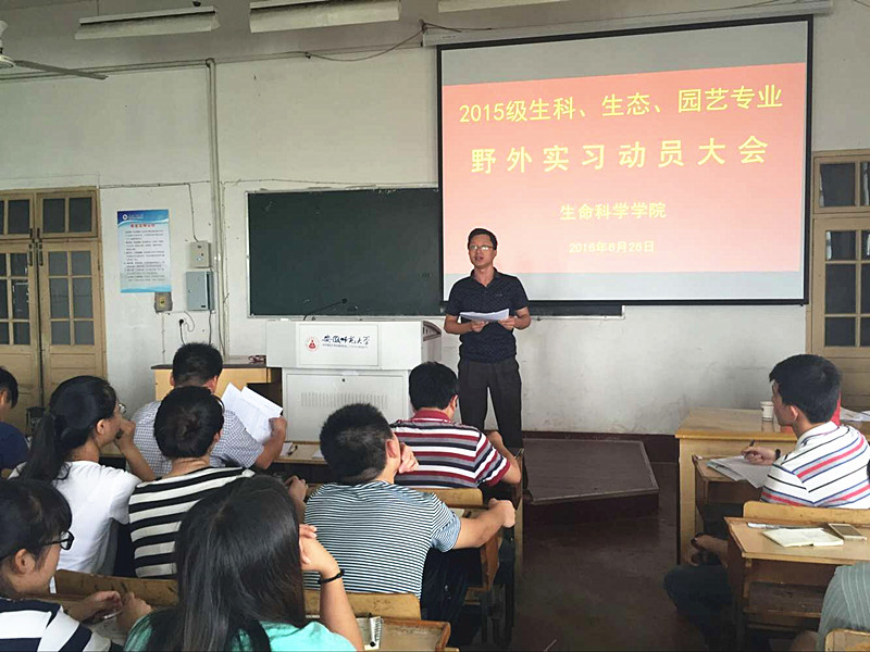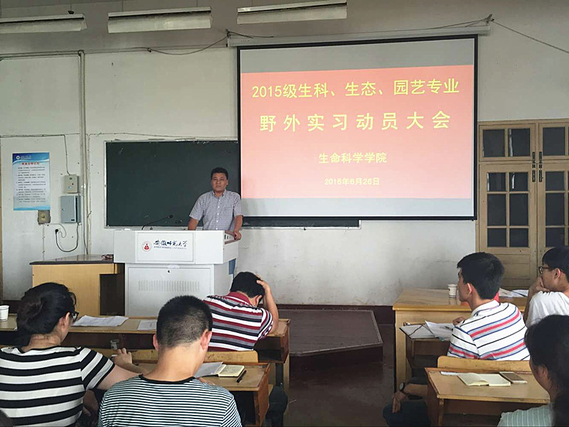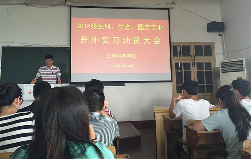 本网讯(生科院 王志)为确保2015级本科生野外实习顺利进行,6月26日,生科院在教学楼1410教室举办了2015级野外实习动员大会。公司教学副经理胡好远老师、植物组邵剑文老师,动物组严云志老师、周科老师及生物科学、生态学、园艺专业全体员工参加此次大会。会议由2015级辅导员王志老师主持。