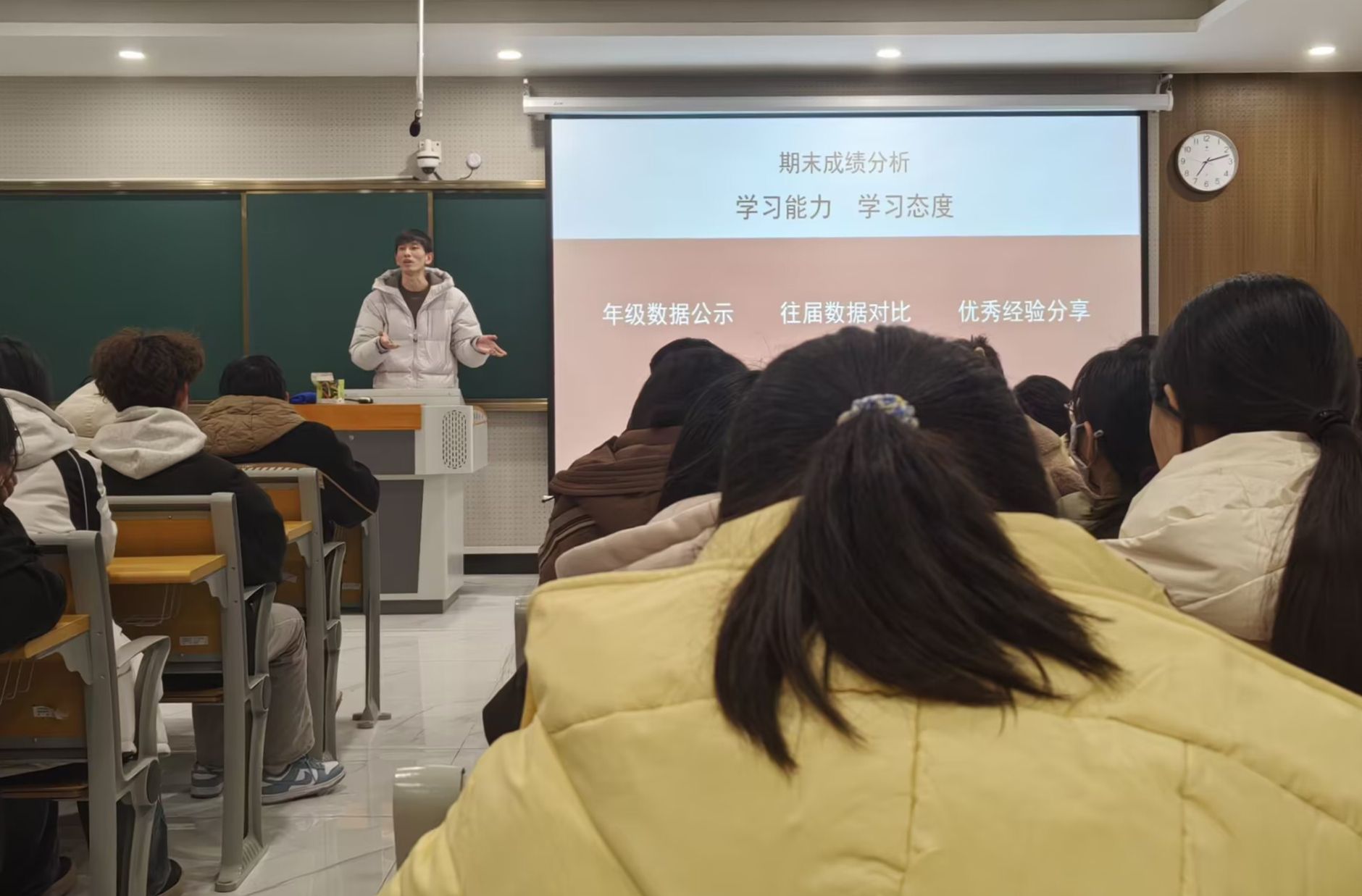 随后,他通过期末成绩分析,帮助同学们找准定位。他邀请各课程第一名分享学习经验,激励全体同学对标先进、制定学习目标。为塑造良好学风班风,他要求课堂手机入袋,发布寝室公约。