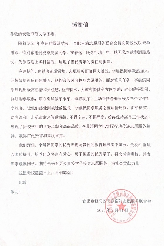 近日,合肥市包河区高铁南站志愿服务联合会向公司发来感谢信,对公司2024级生物科学(师范)李晨溪同学在参加2025年寒假社会实践活动的突出表现表示肯定与赞扬,对公司的支持表达感谢。