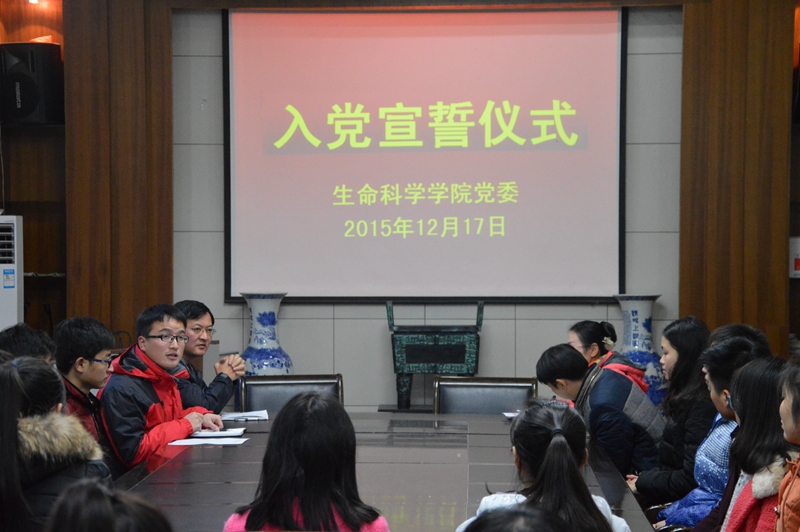 仪式在雄壮激昂的《国际歌》声中拉开帷幕。汪倩倩宣读了2015年下半年新加入的预备党员名单。今年12月份新发展的46名预备党员紧握右拳高举过肩、面向鲜红的党旗庄严宣誓,响亮的誓言传遍会场的每个角落。参会的党员代表重温入党誓词,应邀列席的入党积极分子感受入党的庄严和神圣。