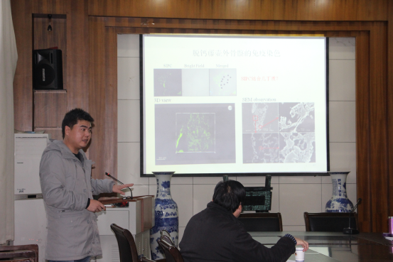 第一场学术报告在公司一楼会议室举行,公司朱国萍副经理主持报告会。张根博士的报告题目是“蛋白组学在生物污损中的应用—p38 MAPK和NO影响纹藤壶附着的分子机制”,他着重介绍了使用无标记蛋白组学的方法,研究p38 MAPK和一氧化氮的两个信号通路如何影响纹藤壶的部分生理功能和代谢过程,以及这两个信号通路的共同下游基因(精氨酸激酶和附着诱导蛋白复合物)的功能。