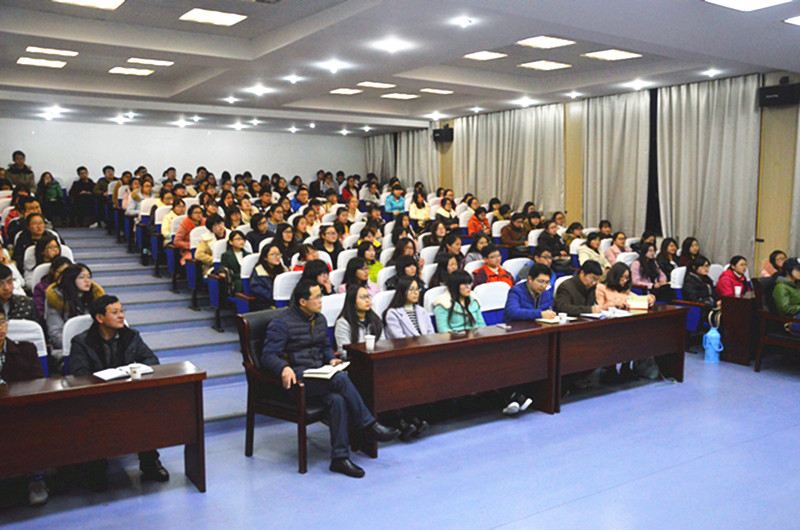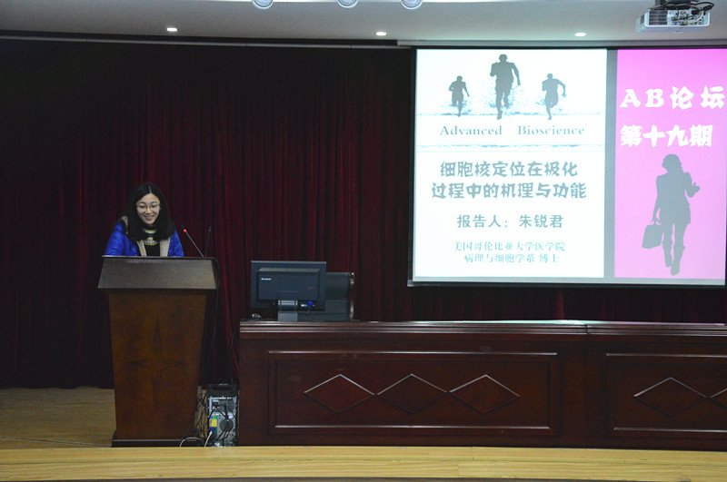 本网讯 (生科院 赵世玉 蒋澜)新学期伊始,为切实落实应用生物科学专业建设人才培养方案,激发学习氛围,促进专业学风建设,生科院AB论坛邀请美国哥伦比亚大学医公司在读博士朱锐君与同学们面对面交流,作题为《细胞核定位在极化过程中的机理与功能》的精彩报告。公司党委副书记刘振杰、应用生物科学专业负责人阚显照、陈冬生副教授、闫浩老师、马晓艳老师和2012级-2015级应用生物科学专业本科生、部分研究生于2月25日晚在赭山校区图书馆报告厅聆听了报告。讲座由阚显照教授主持。