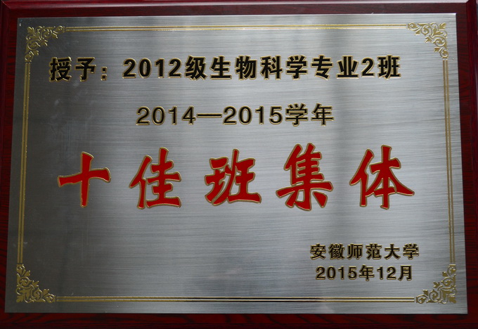 2012级生物科学专业2班共有来自安徽、福建、河北、吉林等11省的46位同学组成。三年来,46位兄弟姐妹努力拼搏,携手并进,班级制度完善、纪律严明、班风优良、学风浓厚,取得了一系列骄人的成绩,班级连续3年实现“零违纪”、“零事故”,班级2年被评为院“优秀班级体”,1次获得校“优秀班级体”奖励。班级同学课程通过率99.8%,80%以上员工进入导师实验室参与科研,10余人次参与老员工创新创新训练项目,在SCI期刊Mitochondrial DNA(If1.209)等发表学术论文4篇,参与的团队被团中央授予“小平科技创新团队”荣誉称号;涌现出校员工会主席关宏蔚、校社联主席张雨晴、院员工会主席张晓倩、新长城自强社赭山校区分会会长朱丽娜、读者协会常务副会长郑秀梅等一大批员工骨干,班级有近50%同学担任了校、院员工组织副部级以上干部;积极参与校园文化创建活动,素质拓展达标率100%,获得了“创青春”全国老员工创业大赛银奖、安徽省老员工职业规划设计大赛金奖等系列省级以上荣誉;同学们信念坚定,乐于奉献,100%递交入党申请书,3人次参加省青年马克思主义者培养工程老员工骨干培训班等研修学习,与芜湖广电1890志愿服务队建立长期合作关系,参与的志愿服务项目获得中国青少年发展基金会、英国大使馆文化教育处“希望工程激励行动”项目资助,多位同学获得中国扶贫基金会志愿者证书、被评为“优秀志愿者”。班级工作扎实,建设成效显著,受到各界好评,中国日报网、中华新闻网、央视网等省级以上媒体报道百余次。