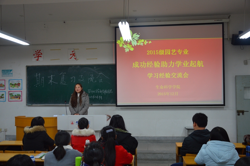 在分专业朋辈学习经验交流会上,被邀请的生物科学专业2012级乔继月(保送浙江大学)、生态学专业2012级施立芳(保送东南大学)等获研究生推免资格的员工,生物技术专业2012级杨莹(年级专业排名第二,拟出国深造),为2015级新生讲解专业课学习方法,传授学习经验。同时,班级综合测评排名第一、荣获校“三好员工标兵”荣誉称号的园艺专业2014级鲁月等同学,为新生讲解如何梳理期末复习思路,解答复习疑惑。