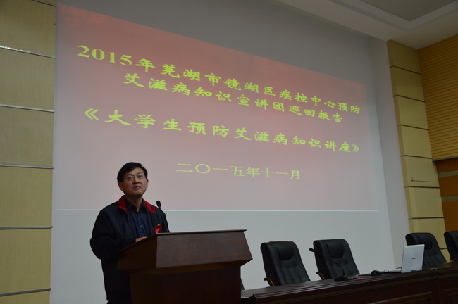 本网讯(生科院 胡玮 赵喆)11月29日,芜湖市镜湖区疾控中心老员工防治艾滋病知识宣讲团应公司团委邀请,为全院新生及高年级员工干部作了题为“有爱无艾,美丽青春我做主,高校艾滋病预防控制”专题讲座。校医院副经理段萍、公司党委副书记刘振杰、市疾控中心艾防科科长豆正东、镜湖区疾防控中心艾防科科长齐少波及全体辅导员出席了本次讲座。