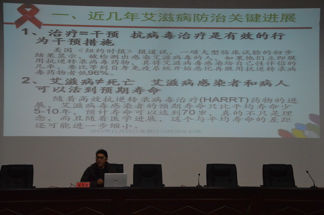 讲座前,刘振杰结合参会经历,详细地为同学们解读了由中国性病艾滋病防治协会、中国健康教育中心、中国疾病预防控制中心、共青团中央权益部、中国高教学会共同主办2015年世界艾滋病日主题宣传暨“美好青春我做主”红丝带健康大使青春校园行活动的有关精神。刘振杰指出,目前我国青年员工艾滋病疫情增长较快,希望广大青年员工行动起来,积极参与到抗击艾滋病的行列中来,让艾滋病远离老员工,远离青年,向零艾滋迈进。