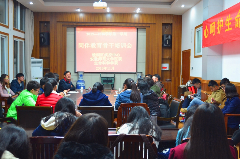 共担责任铸造坚固防线 11月30日,在校医院、镜湖区疾控中心的指导下,老员工保健协会开展了2015年同伴员骨干培训会。会上,刘振杰强调,开展预防艾滋病宣传教育活动,要与性健康教育有机结合,将性道德、性责任、预防和拒绝不安全性行为作为重点,切实提高员工的自我防护能力,让青春更健康,让人生更精彩。他号召每一位生科学子积极行动起来,发挥骨干力量,“合力抗艾,共担责任,共享未来”,为早日实现零艾滋贡献青春正能量。段萍指出同伴教育对高校老员工艾滋病防治工作具有十分重要的意义,希望广大同伴员能够深刻认识同伴教育的作用,掌握系统的预防艾滋病知识,提升处理同伴压力与交流的技能,帮助更多的老员工了解艾滋,远离艾滋。