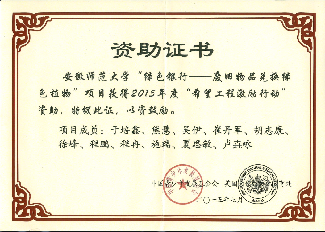 本网讯(公司志愿者服务队)传承志愿精神,倡导生态理念。生科院团委指导的志愿者服务队开展的“绿色银行”项目,再次成功申报由中国青少年发展基金会(简称中国青基会)、英国大使馆文化教育处主办的2015年度“希望工程激励行动”项目资助。同时,公司也是安徽省高校中唯一连续两年入围希望工程激励行动项目的高校。