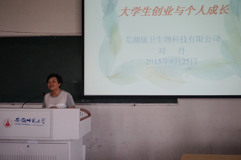 本网讯 (生科院 罗平平 蒋澜)9月25日下午,AB论坛第17期邀请芜湖康卫生物科技有限公司生产总监刘丹副研究员作题为《老员工创业与个人成长》的讲座,应用生物科学专业负责人阚显照、新生辅导员和全体2015级生物技术、应用生物科学(生物制药)专业同学在赭山校区教学楼1410教室聆听了报告。讲座由阚显照教授主持。