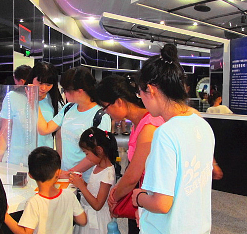 两路多观科技馆,赏当今科技之光 7月12日,实践调研团队前往合肥市科技馆进行科普宣教活动。同学们兵分两路,馆外同学们与前来参观的小员工旅行团互动,并了解他们对生物知识的了解程度,与此同时也向他们普及生物知识,分享生物奥秘。馆内,很多小员工向同学们询问生物有关知识,同学们认真倾听耐心解答,并带领小员工们学习了科技发展史与科学家的创新精神。