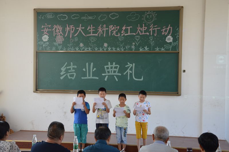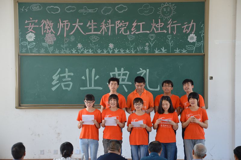 典礼上,洪雅县关工委周明第对安徽师大生科院“红烛行动”团队为期21天的支教活动给予高度评价,对安徽师大师生的杰出表现给予充分肯定,对志愿者的乐于奉献致以深深的谢意。柳江镇党委委员谢福均号召孩子们起立,向团队师生鞠躬表示感谢。志愿者代表徐双双深情回顾了爱心支教的历程和取得的成果。孩子们通过文艺演出的形式展示了20多天的学习成果,朗诵《感恩的心》、舞蹈《虫儿飞》、歌曲串烧、手语《最美的未来》……每个节目都饱含了浓浓的师生情,表达了对支教老师的敬爱和不舍。“就在启程的时刻,让我为你唱首歌……”,志愿者用《启程》的歌声表达了对孩子们的美好祝福。