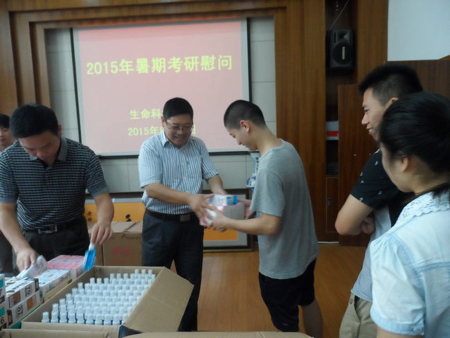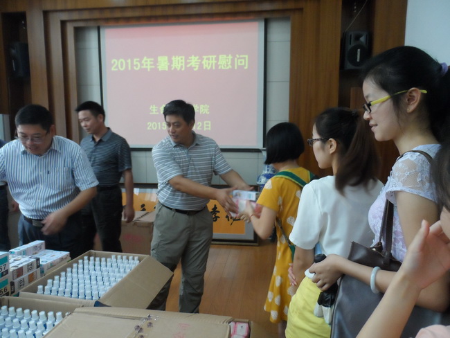 本网讯(生科院 黄振新)八月江城,烁石流金;考研学子,热情高涨。在生科学子激战酷暑积极备考2016年硕士研究生入学考试之时,8月12日,生科院开展了考研慰问活动,袁兴龙、吴孝兵、刘振杰、吴海龙等公司领导为考研学子打气加油,勉励同学们刻苦勤奋,用努力拼搏创造辉煌。