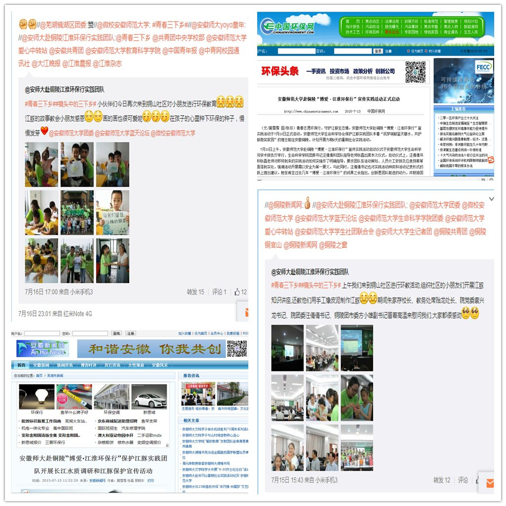 据悉,实践团队在活动过程中,采用前期准备与后期总结相结合的方式,找寻源头、发现问题、解决问题、开拓创新,志愿者们怀揣着对生态环境保护的爱与责任心,始终坚持奔走在环保第一线。据统计,本次实践活动共召开会议近20次,活动开展地点10个以上,培育环保志愿者达200名,直接影响2000余人。活动受到了搜狐新闻网、中国环保网、中华环保宣传网、环境与生活网、安徽新闻网等11家外界媒体跟踪报道32篇,校院网站跟踪报道13篇,铜陵市广播电视对活动进行同步直播。活动借助微博、微信、Myouth等新媒体平台获得广泛认同,校团委及师大蓝天五期优秀微博展中,连续四期展示我团队活动微博,并得到包括安徽共青团、铜陵共青团、芜湖镜湖区共青团和南京守望者在内的12家微博媒体转载。