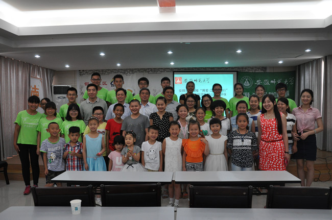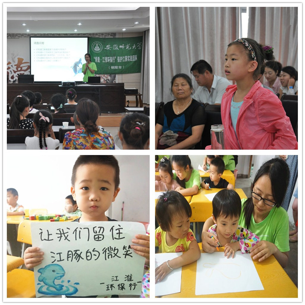 7月14日,实践团队联合安徽大学环境保护协会于铜陵市中央广场举办爱豚答谢晚会,以爱豚之心共同向铜陵市民宣传江豚保护相关知识,呼吁更多的人加入环保志愿者的行列,为生态环保事业出一份力;7月15日至16日,实践志愿者们走进铜陵市铜山社区开展以“保护江豚”为主题的环保教育活动。在社区幼托所,志愿者们结合寓教于乐的教学方式,给小朋友上了别开生面的环保教育小课堂,使环保知识和环保理念在孩子们的心中萌芽。此行受到校院领导与铜陵团市委的广泛关注,副董事长朱家存、教务处处长席贻龙、生科公司党委书记袁兴龙、院团委书记汪倩倩冒着烈日高温一行来到铜陵市,与铜陵团市委副书记方小雄一同亲切慰问生科院“博爱·江淮环保行”保护江豚暑期社会实践团队的师生。领导赞扬了团队志愿者们吃苦耐劳、团结合作的精神,鼓励志愿者们继续努力,做到真正的“筑梦青春,植根沃土,奉献自我”。