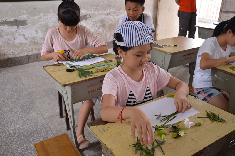 走进植物王国,体会植物魅力。志愿者播放了《植物王国》视频,千姿百态的植物引起了孩子们浓厚的兴趣。他们通过ppt讲解植物贴画的制作方法,孩子们学会方法后都跃跃欲试。在志愿者的带领下,孩子们有序的在校园里采集各种植物叶片作为素材。在志愿者的启发下,孩子们充分发挥想象的智慧,用树叶进行贴画创作,通过亲手制作,一幅幅创意作品展现眼前,孩子们体会到了植物的魅力。