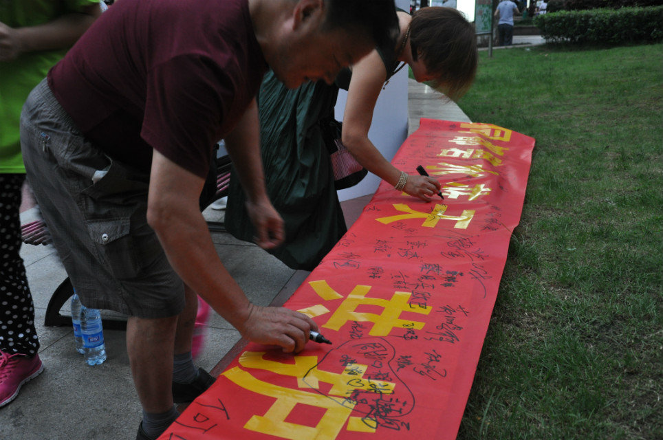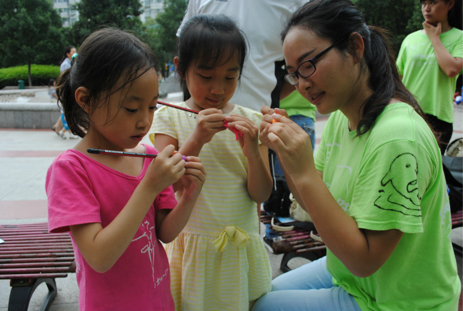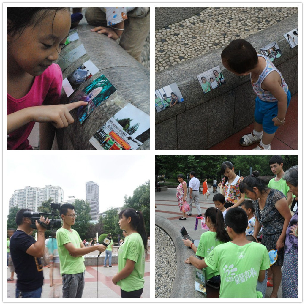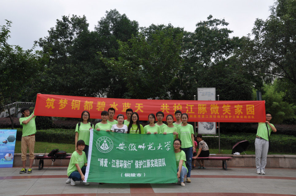 广宣分为六个展区,“照片墙展区”、“宣传展板区”、“手绘江豚区”、“制作江豚区”、“视频播放区”和“万人签名区”。志愿者们用感人的江豚之歌《感谢》及动感的“小苹果”舞蹈开场,吸引众多前来散步的市民。在志愿者的真诚宣传下,市民们纷纷走入六个展区,跟随着志愿者们的脚步,认识江豚,了解江豚,保护江豚。图片墙展区展出的是九天来,我团队前期江豚调研及宣传的作品,讲解员在一旁随着照片向人们诉说江豚生存现状、长江水质调研报告、城市污水处理情况、社区宣教成果等一系列内容;宣传展板区展出了赴铜陵江淮环保行团队三年来的活动与成果,通过我们多年的坚持,环保理念已经越来越多的被铜陵市民接受,讲解员为前来观看的市民们科普长江生态环境及包含江豚在内的野生动物保护相关知识;在手绘江豚区和制作江豚区内,小朋友们在志愿者哥哥姐姐的耐心教导下亲手制作出可爱动人的“微笑天使”和栩栩如生的“长江女神”; 视频播放区内,团队制作的以前几天活动拍摄的江豚视频循环播放,讲解员们向驻足的市民们耐心讲解江豚生活习性及生存现状;最令人感动的便是万人签名区,来自师大生物系的员工、铜陵公司的老师等广大市民主动加入我们爱豚的行列,留下祝福,签下姓名。来自铜陵公司的老教师爷爷说道:“通过这种形式的宣传,以真实的照片和朴实的语言介绍环保知识,让我们这些人更加容易接受,给你们点个赞。”