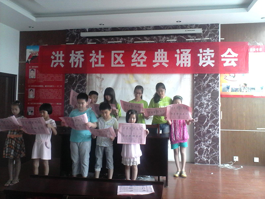 一周后,队员来到洪桥社区,在辅导孩子们功课的同时,他们先后开展了讲故事比赛、成语接龙、经典诵读等一系列活动,带领员工学习传统文化。