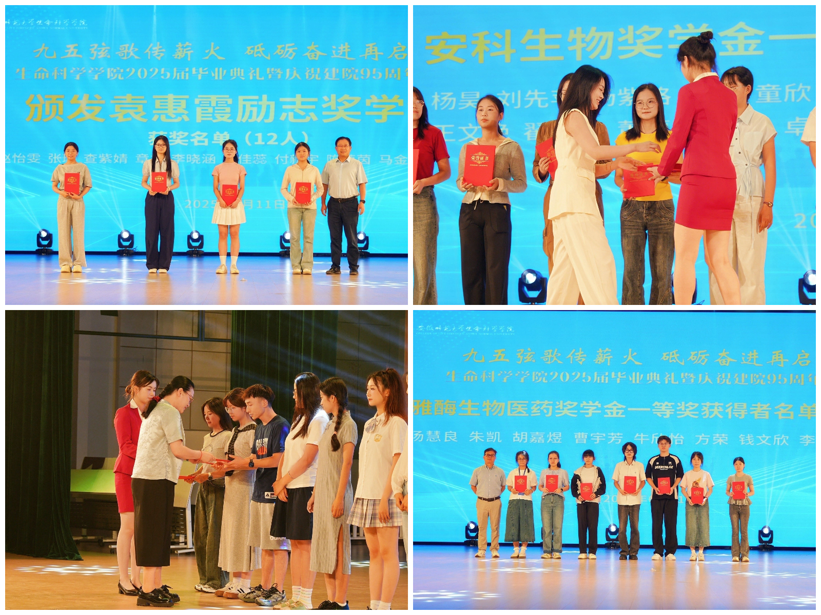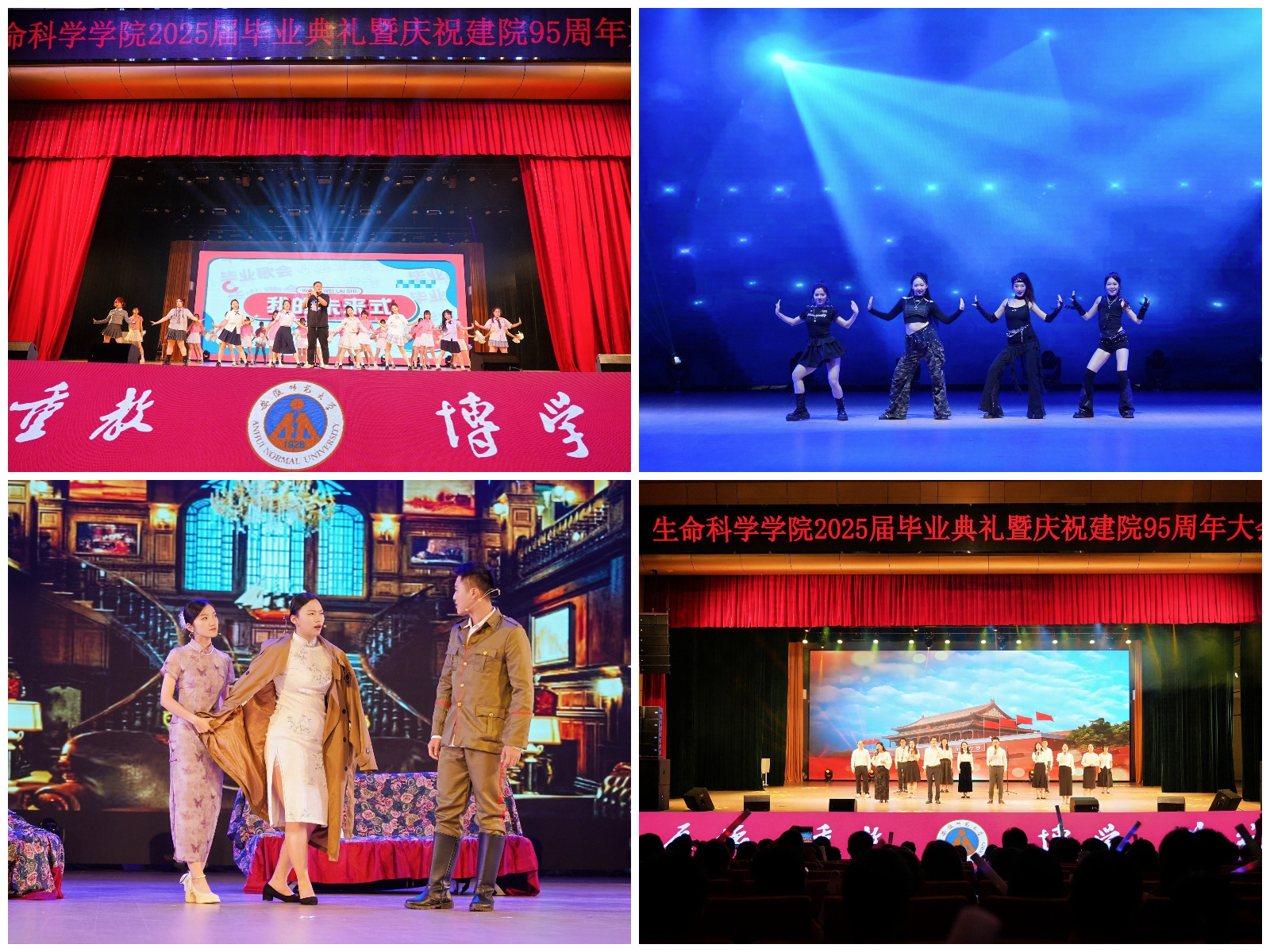 大会以青春洋溢的开场舞《我的未来式》拉开帷幕。一首合唱《国家》,旋律激昂情满华夏,歌声里家国情怀交织,共筑盛世繁华之梦。音乐公司贺送的唢呐独奏《打枣》,灵动音符跃动似枣儿翻飞,尽显田园丰收喜悦之景。随后,大会现场依次颁发了安科生物奖学金、袁惠霞励志奖学金和雅酶生物医药奖学金,员工代表吴军向学弟学妹们分享职场经验与人生感悟,勉励毕业生勇敢追梦。2025届生物科学(师范)专业选送的舞蹈串烧《花样年华》将现场气氛推向高潮,文公司贺送的话剧《风声》,展示了隐秘战线的同志和敌人激烈交锋,诠释信仰的力量。院研究生会选送的双人合唱《飞云之下》,悠扬歌声似云间清风,诉说着对远方与梦想的深情向往。