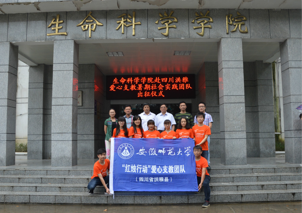 本网讯(生科院 吕速 何所惧)带着领导老师的殷切期望,怀着炽热的奉献之心,载着一年前的洪雅之约,2015年7月,生科公司9名爱心志愿者带着“践行‘八字真经’,投身‘四个全面’”的主题奔赴四川洪雅县柳江小学开启为期一个月的爱心支教行动。爱心支教的火炬正式点燃,将为洪雅山区的孩子们带来温暖阳光。