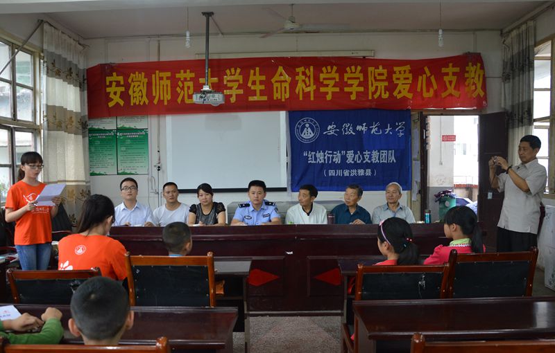 7月13日上午9时,赴四川洪雅“红烛行动”爱心支教夏令营开学典礼正式举行。洪雅县关心下一代委员会常务副主任周明弟、洪雅县柳江镇团委书记刘彬、柳江镇派出所副所长胡柯、柳江镇中心小学教导主任张利琴、安徽师范老员工命科学公司政治辅导员何所惧、洪雅县老年志愿者王永康等出席了典礼。