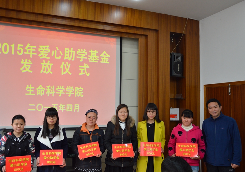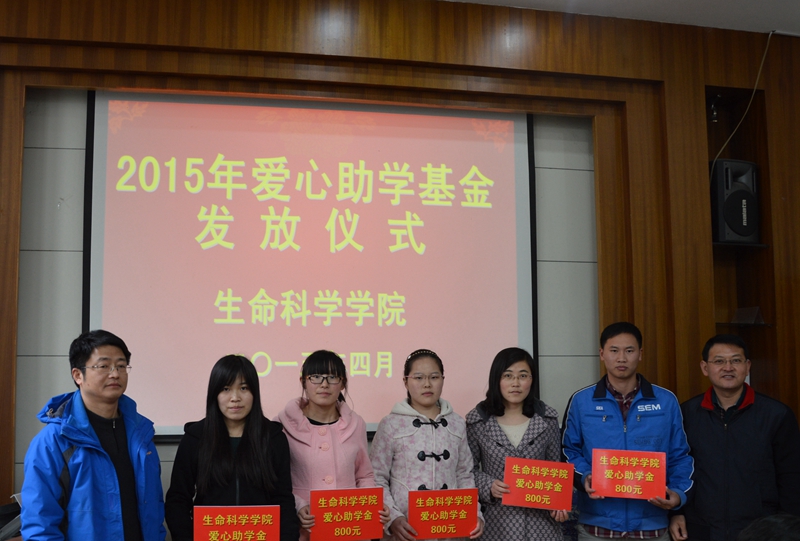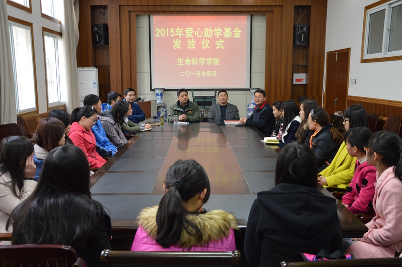 本网讯 (生科院 蒋澜 赵喆 )4月8日下午,生科院2014-2015学年爱心助学金发放仪式在院一楼会议室举行,公司领导为24名受助学子每人发放800元的爱心助学金。公司党委副书记刘振杰主持发放仪式。
