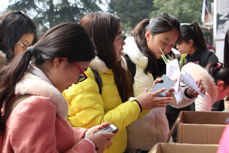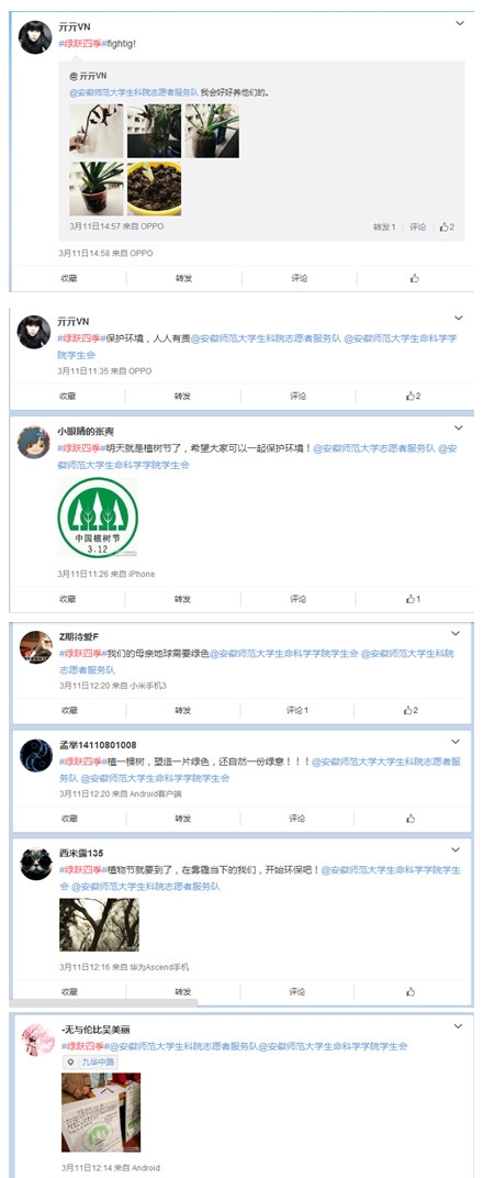 志愿者们早早摆起展台,以饱满的热情为参与的同学解疑答惑。此次展出三块展板,分别介绍了绿植的意义、雾霾的危害以及活动的参与方式。活动现场,同学们纷纷用手机参与#绿跃四季#微博话题讨论,或分享绿色标语到朋友圈和QQ空间,签署一份绿植领养承诺书,即可免费获得一株绿植。